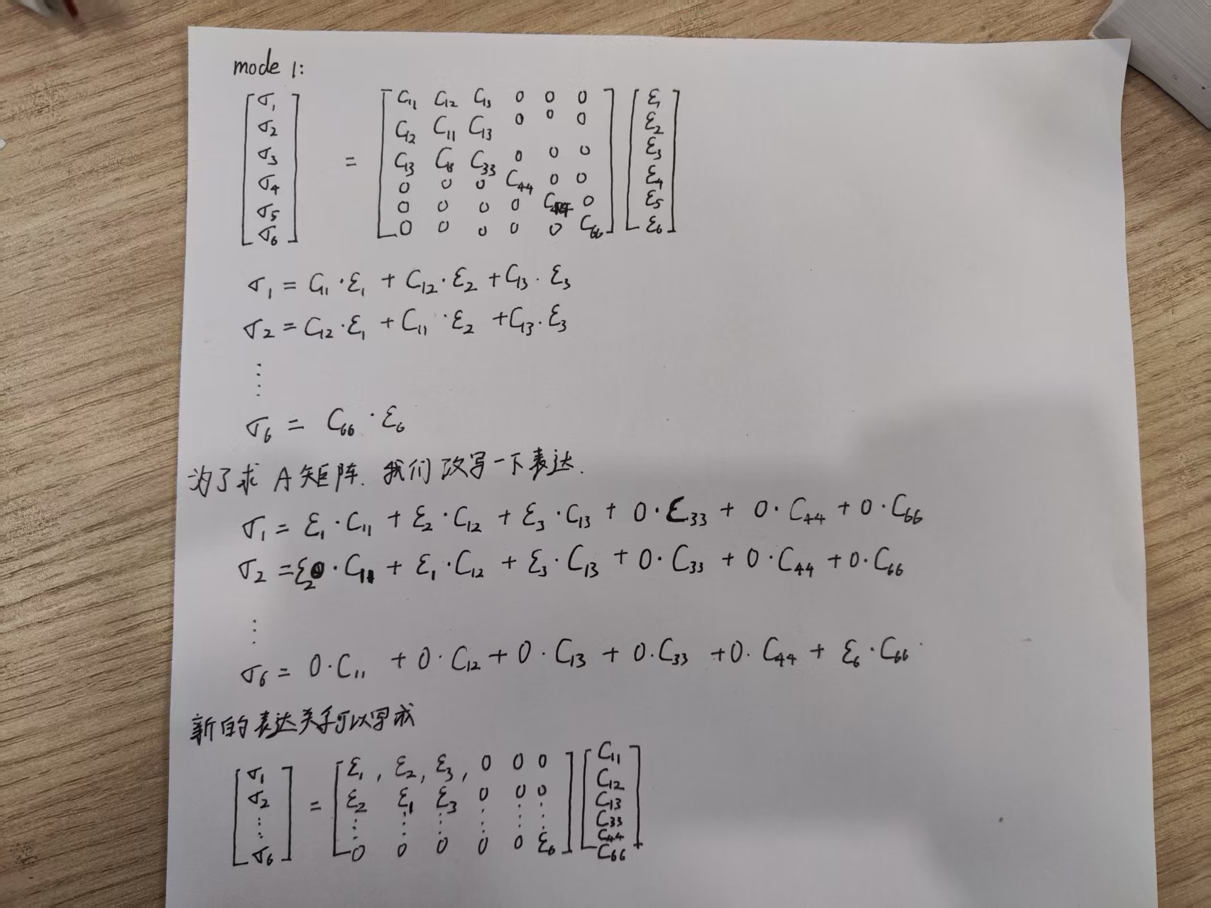 因为lstsq的工作原理是B = A * X,根据已知应变A、应力B,用最小二乘法拟合一个为列向量的系数,X,(这里即Cij)